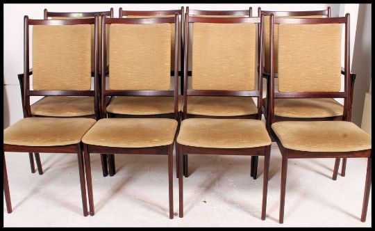 A set of 8 retro rosewood dining chairs by Spottrup of Denmark. The solid rosewood frames having angular uprights with padded velour seats and back rests. Complete with the 'H.F. Spottrup, Made in Denmark' makers label to the base. Matching dining table in lot 1026. Measures H102 x W54 x D56 (cm)