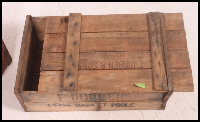 A vintage 20th century fishmonger's wooden crate / trug with notation together with a vintage Corona bottle crate having sectional interior Largest 48h. Advertising interest. 33x42x31cm b