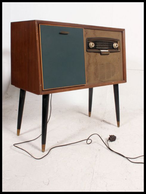 A vintage mid 20th century Bush radiogram having an inset RC121 Garrard deck. The cabinet in teak and vinyl raised on tapering legs H82xW84xD38cm
