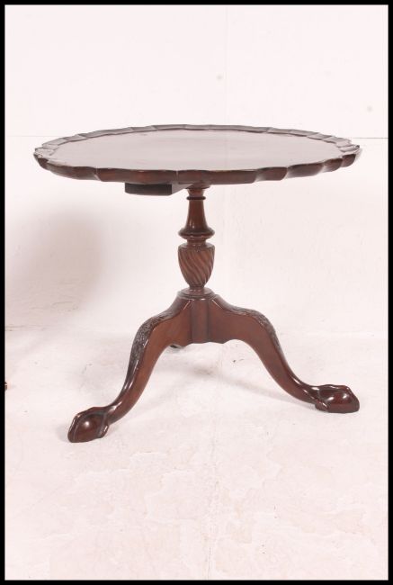 An Edwardian mahogany toilet swing mirror on scrolled base together with a pie crust occasional table. Measures H106 x W72 x D68 (cm)
