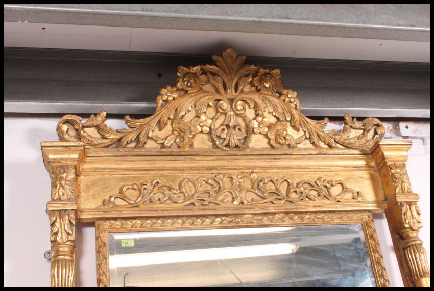 A very large 20th cenutry full length mirror having a giltwood frame of rococo design with large carved crest to the top. All standing on a white marble top base on turned and fluted supports. 255x130x52cm