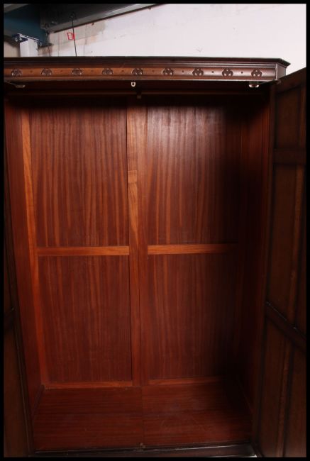 A pair of Jacobean revival Jaycee bedrooms suite comprising dressing table and ladies and gentlemans wardrobes having fitted interiors. Measures H183 x W124 x D57 (cm).
