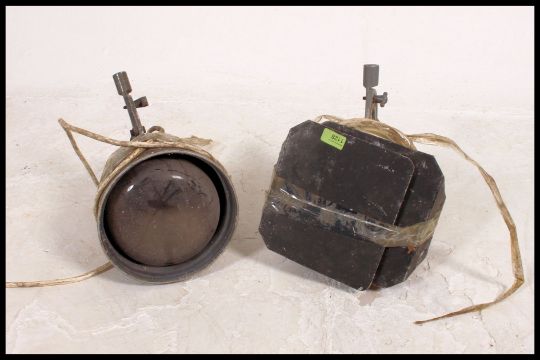 A pair of vintage 20th century theatre spot lights, one retaining barn doors, both with the original cast brackets