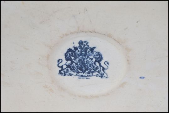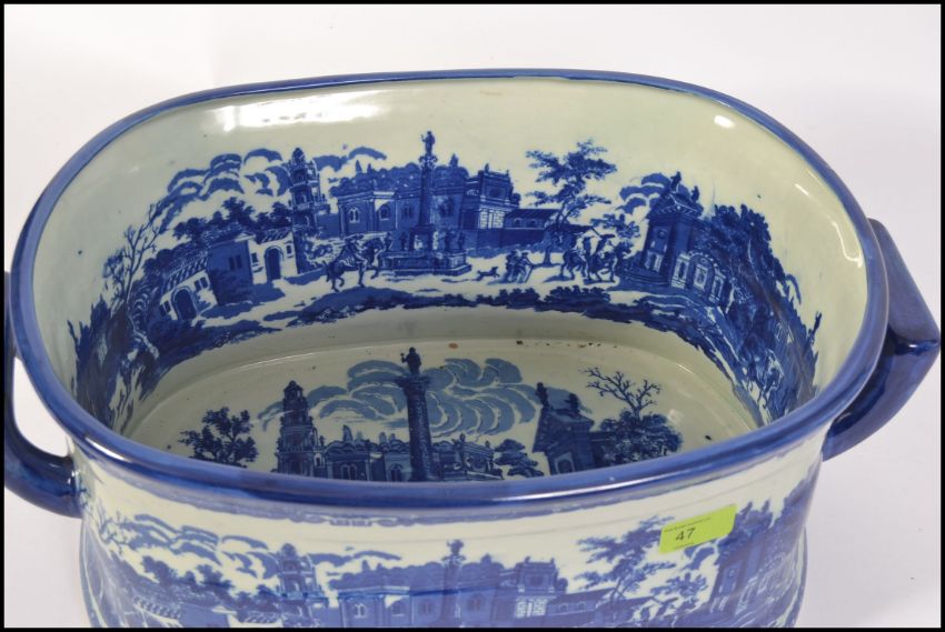A large Staffordshire blue and white foot wash bowl. The large ceramic bowl with handles and transfer printed decoration H21cm