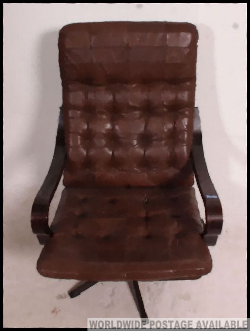 A stunning leather and bentwood swivel armchair in the Danish manner. The quadruped base supporting a stunning show wood bentwood frame with original brown leather section padded seat and back rest. Measures H100 x W67 x D79 (cm)