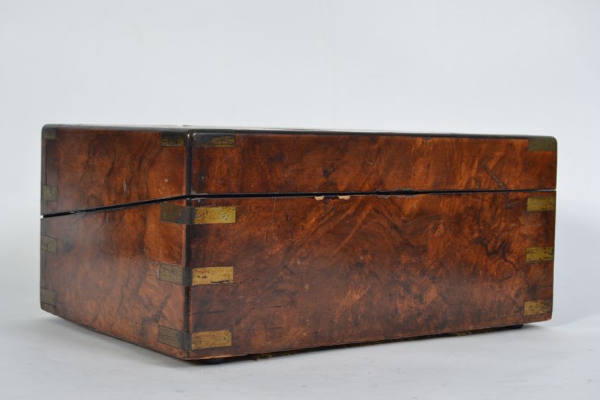 A 19th century brass-bound writing slope box with spring-loaded secret compartment, inkwells etc having a gilt tooled leather writing surface. Measures H17 x W39 x D27 (cm).