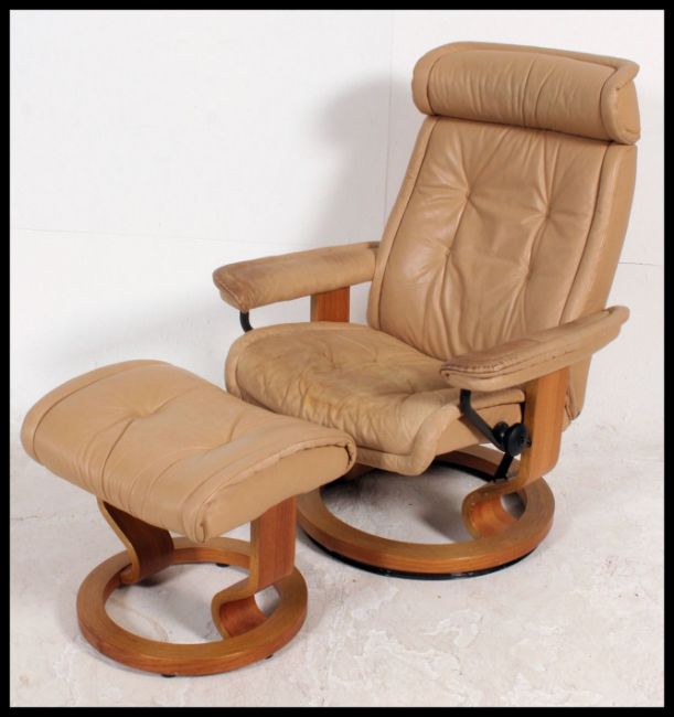 A vintage 20th century Ekornes ' Stressless ' reclining swivel armchair raised on bentwood base with tan leather upholstery complete with the ottoman footstool. Measures H100 x W77 x D66 (cm).