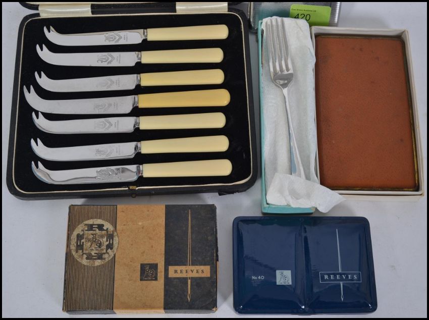 Two vintage 20th century cigarette cases along with a set of cased cheese knives and other items