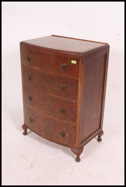 A 1930's Art Deco oak bow front chest of drawers raised on cabriole legs with pad feet having upright bank of drawers with original handles 102x79x50cm