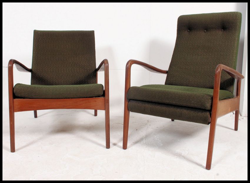 A 1970's original pair of teak Danish influence armchairs in the manner of Scandart. The show wood teak frames with stunning angular arms having original upholstered sprung seat and backrest H92xW69xD75cm