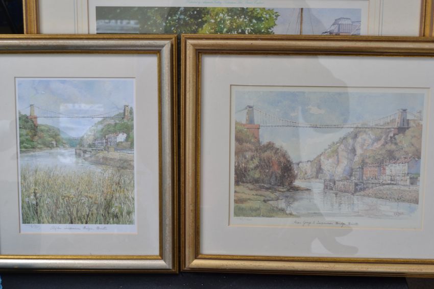 A framed and glazed limited edition print of Bristol Bridge 664 / 850 by Frank Shipsides, signed in pencil along with two framed and glazed limited edition prints of Clifton Suspension bridge by Pace.