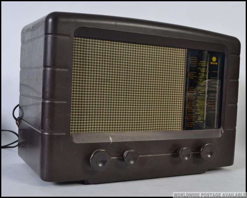A vintage early 20th century Pye bakelite valve radio with decorative facia