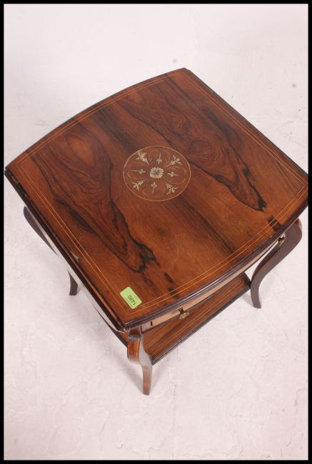 An Edwardian rosewood and marquetry inlaid drop leaf side / lamp table in the manner of Edwards & Roberts. Raised on serpentine supports with single frieze drawer having top with drop flaps either side. 69cms x 92cms x 50cms