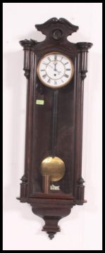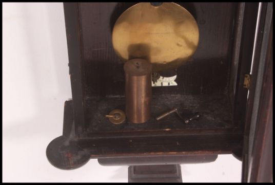 A 20th century Vienna wall clock in the manner of Gustav Becker, with glazed door enclosing dial with Roman numerals, pendulum and winding key H120xW50xD17cm