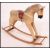 A retro 1970's corduroy rocking horse with saddle and stirrups raised on wooden rockers