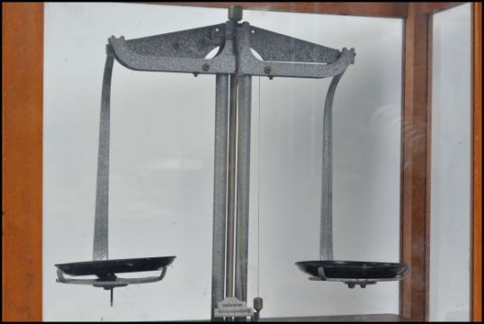 A cased set of mid century Scientific scales. The scales complete and in the original glass and teak wood case H40cm
