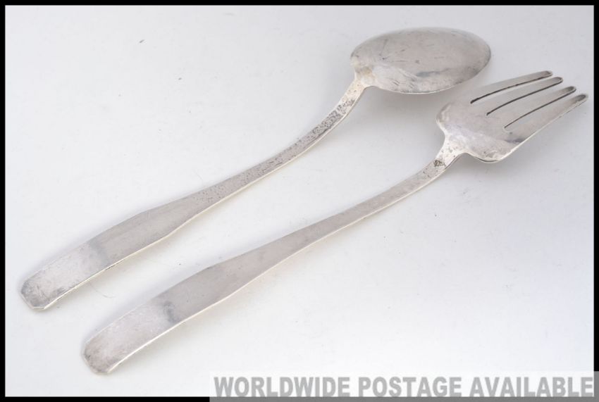 Of American interest, A pair of reservation coin silver salad servers - Navajo with chase decoration of arrows and birds 123g