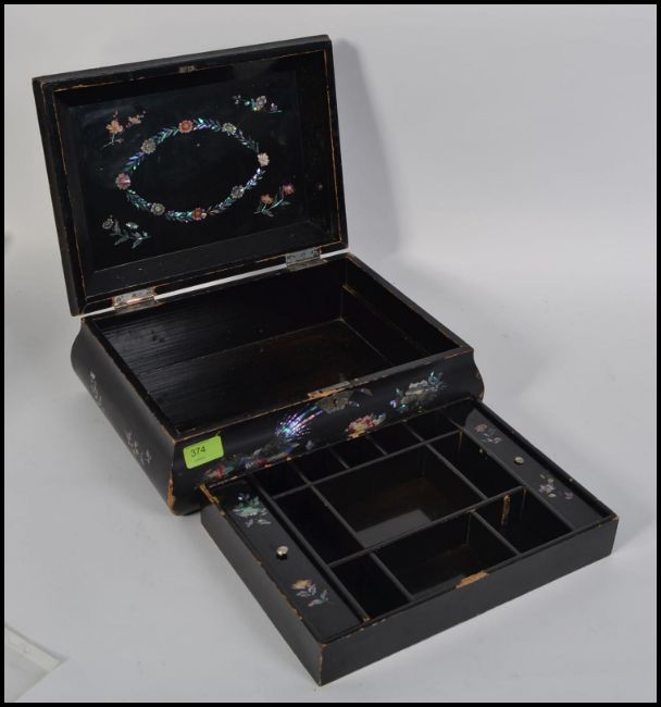 A mid 20th century mother of pearl inlaid jewellery box / workbox having a hinged lid opening to reveal a lined interior on removable tray W36cm