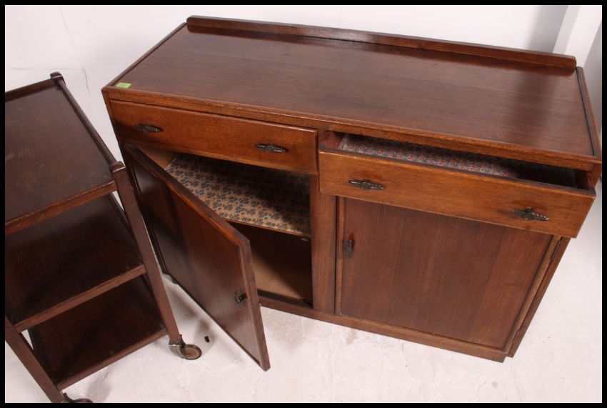 A CC41 utlity marked sideboard having short drawers over cupboards to base together with a matching oak trolley. Matching table and chairs in lot 1390a H85xW122xD46cm