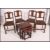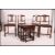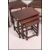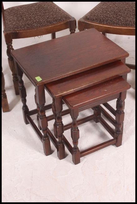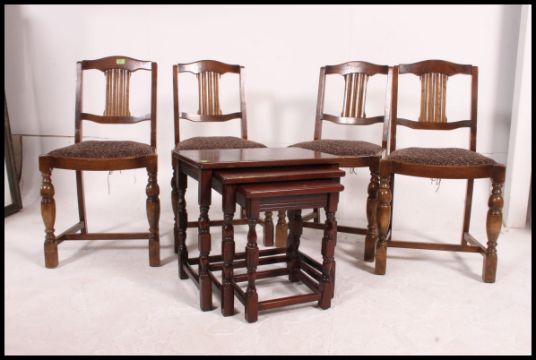 A set of 4 Ercol dark wood dining chairs with walnut back rests on turned legs with pad feet, Ercol stickers to underside. Together with a nest of tables