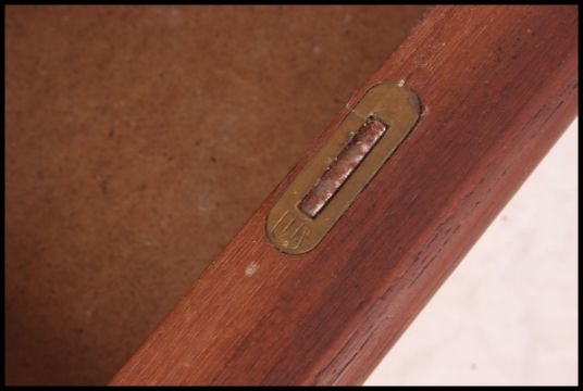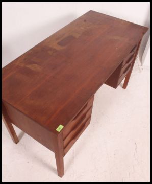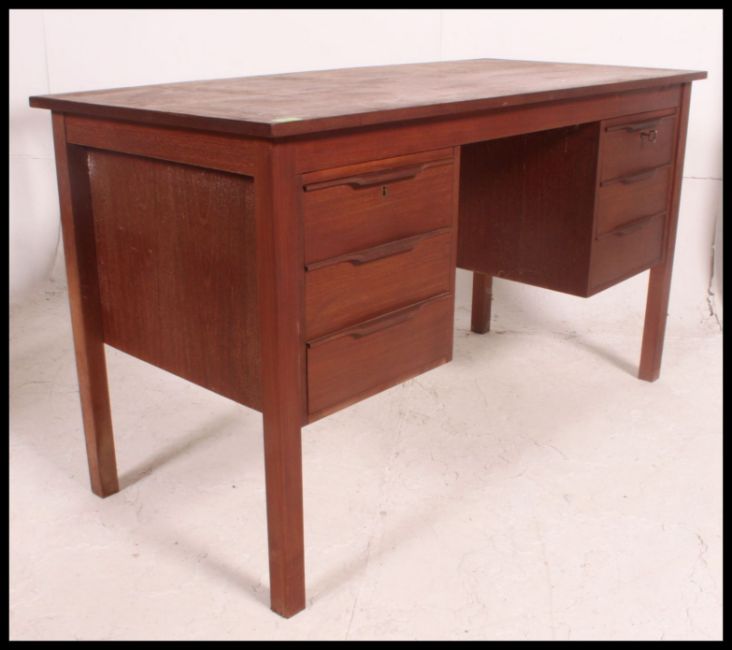 A retro 1970's teak wood Danish influence desk. Raised on squared legs with fitted drawers either side of kneehole recess having flared top above H74xW130xD60cm