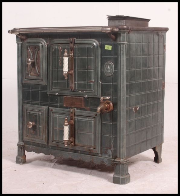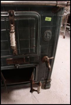A 19th century French enamel Godin Range cooker stoke. The beautiful range having shaped legs with enamel dark turquoise colours with sectional top, oven doors etc to facia H85xW75xD62cm