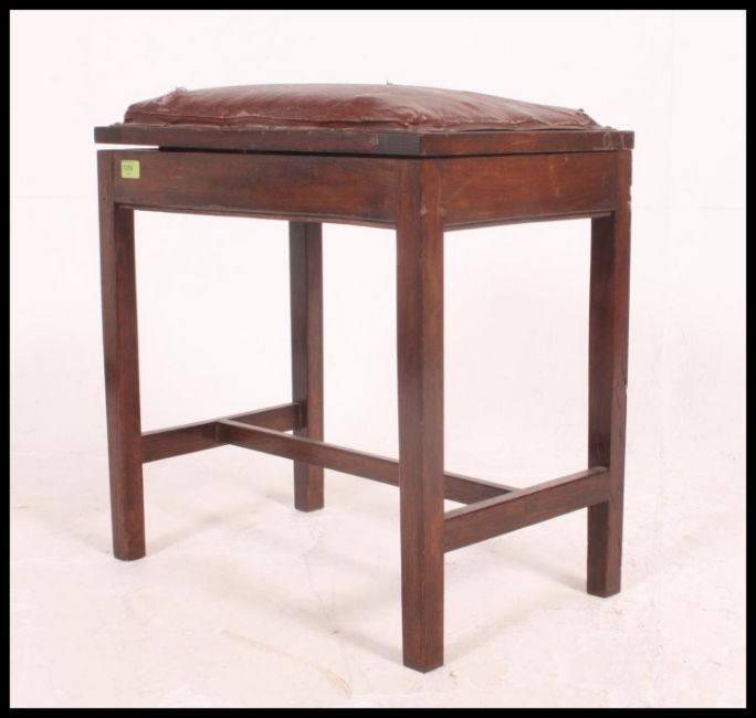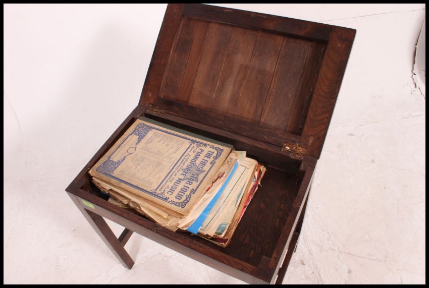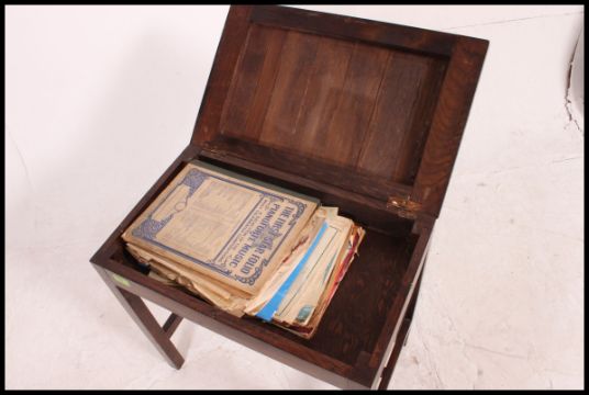 A Victorian oak duet / piano stool raised on tapered square legs with upholstered seat with hinged top and sheet music storage to underside