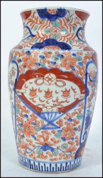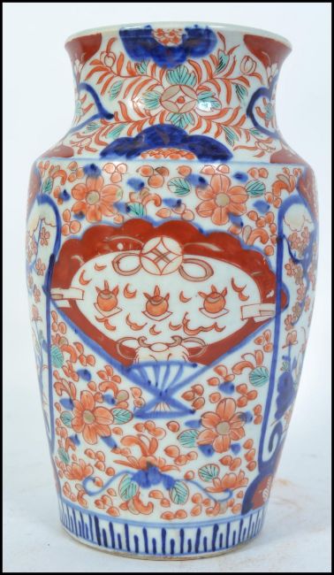 A Chinese famille rose / Imari vase having decorative panel scenes with waisted neck and character markings to the base H24cm