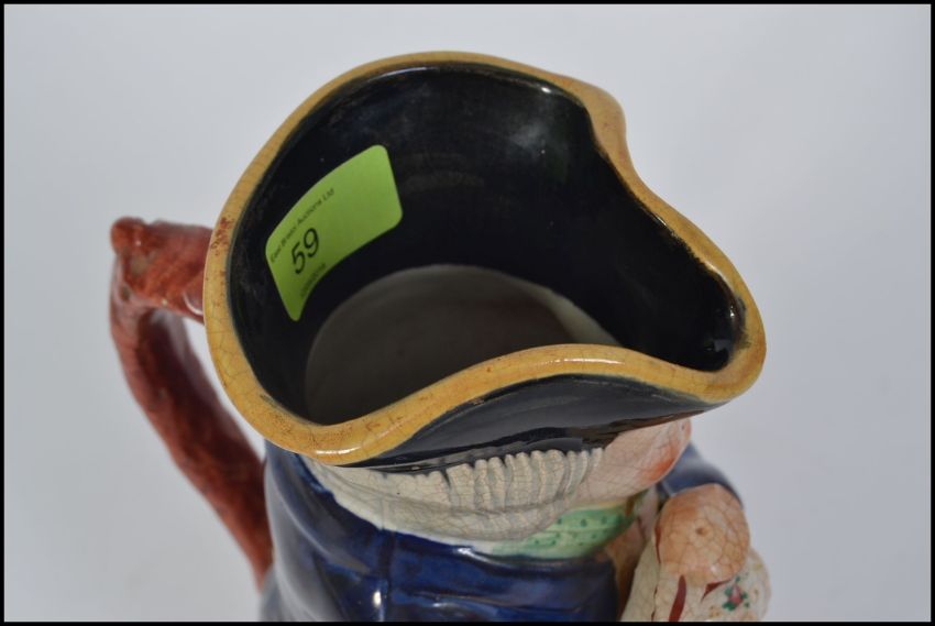 A 19th century Staffordshire Ralph Wood-type Toby jug in the form of a seated Toby Fillpot holding a jug of ale, wearing blue frock coat and black tricorn hat. 24cm tall