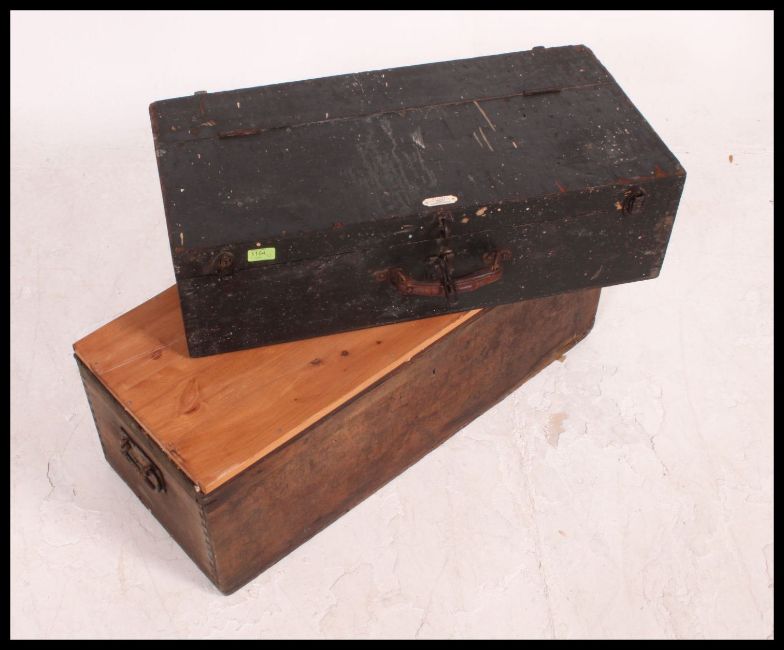 A vintage ebonised pine tool box (with later lid) along with a vintage travel trunk, both of rectangular form. Measures H30 x W88 x D37 (cm).