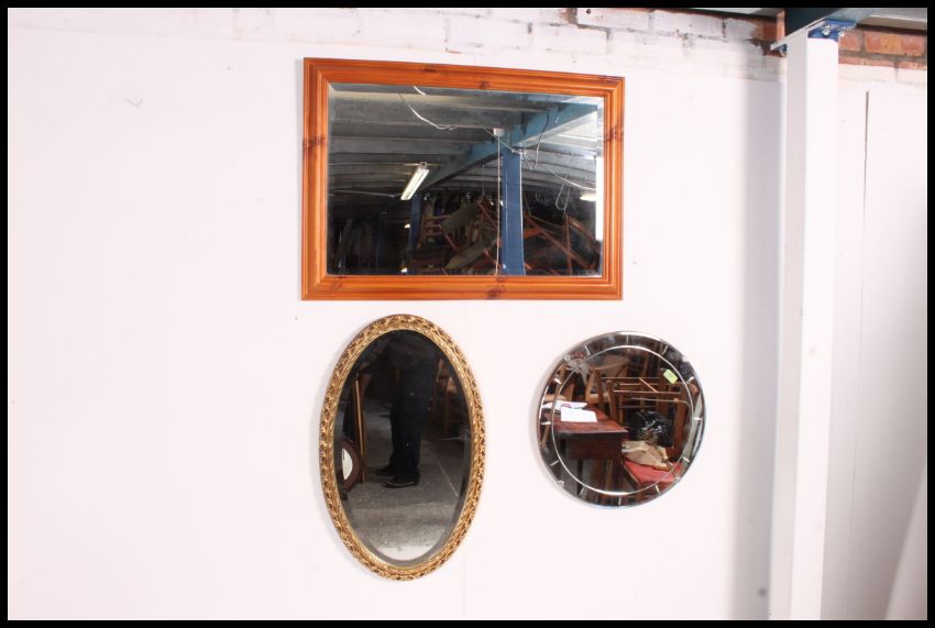 A bevelled edge art deco mirror along with a reproduction oak framed bevel edge mirror and a contemporary large pine framed mirror. 87x53cm