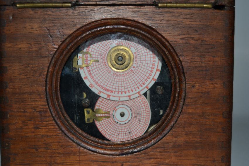 A vintage wooden cased Belgian chrome pigeon clock. The chrome barrel clock with glass facia and original case