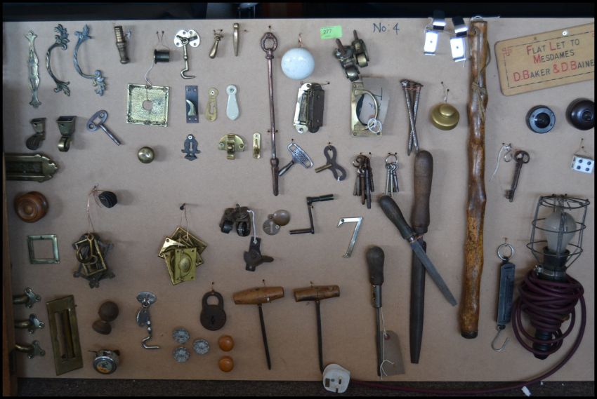 A fabulous collection of mounted handles, hinges, tools, doorknobs, brackets etc dating from the Victorian and 20th century. To include Arts & Crafts, Victorian, Edwardian, some Georgian etc