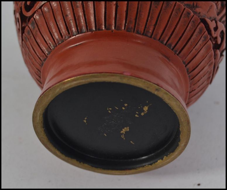 A Chinese Cinnabar style red laquered brass vase having decorative design in relief work of foliates with waisted neck, stamped to the base H16cm