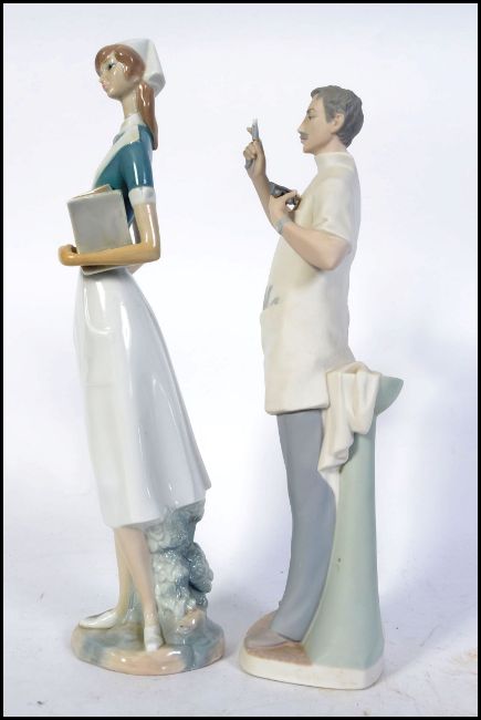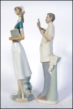 A Lladro figurine of a nurse no. 4603 by S Furio, 1969 - 1978 along with a Lladro porcelain figure of a dentist standing holding a tool for extracting teeth with a tooth by S Furio, 1969 - 1978 35cm ( early repair to extraction tool )