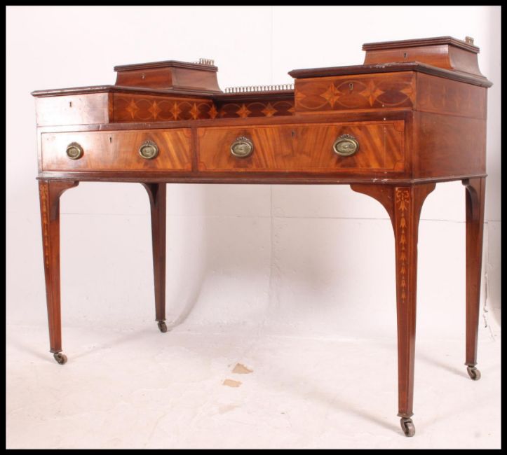 A late 19th century Carltonhouse mahogany desk of typical form with marquetry and line inlaid decoration, brass galleried upper section, an arrangement of drawers flanking a central gilt tooled leather writing surface. Mahogany lined drawers with Hobbs & co locks. 100cms x 125cms x 59cms