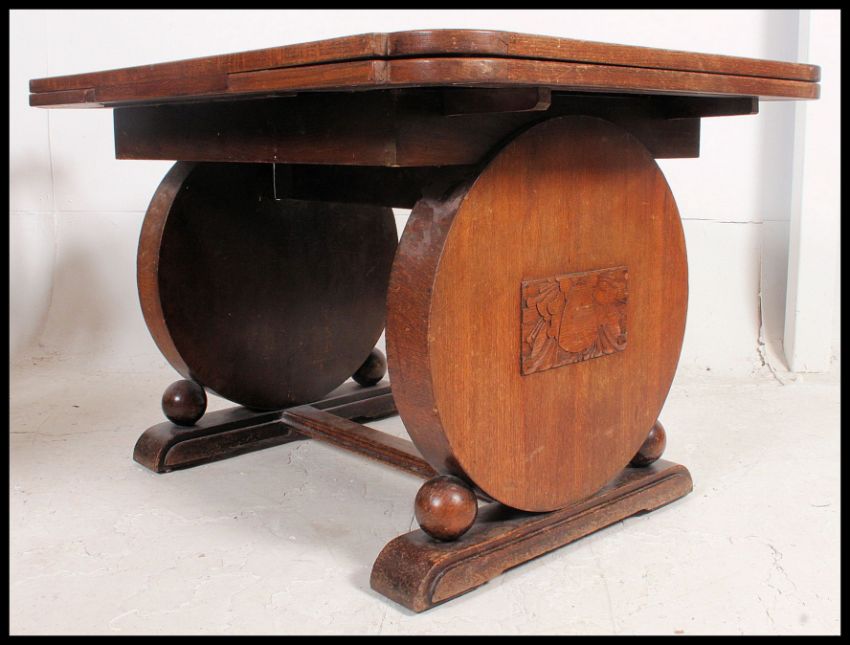 An excellent large 1930's Art Deco oak refectory draw leaf dining table raised on roundel pedestal supports with extending table top above