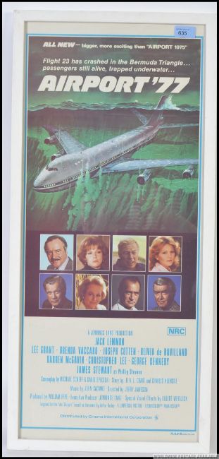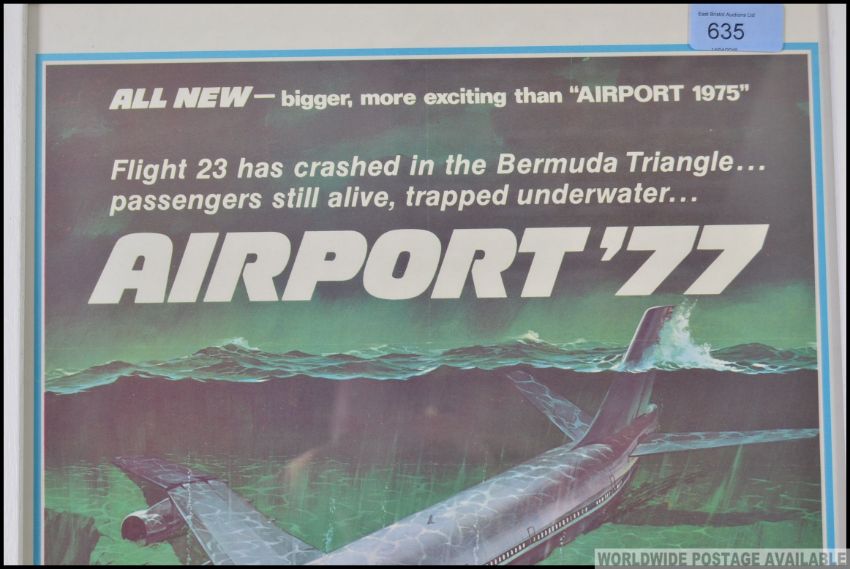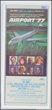 AIRPORT '77: An original cinema advertising poster for the disaster film Airport '77 starring Jack Lemmon and James Stewart etc. Framed and glazed. Unfolded. 80cm x 37cm (framed size)