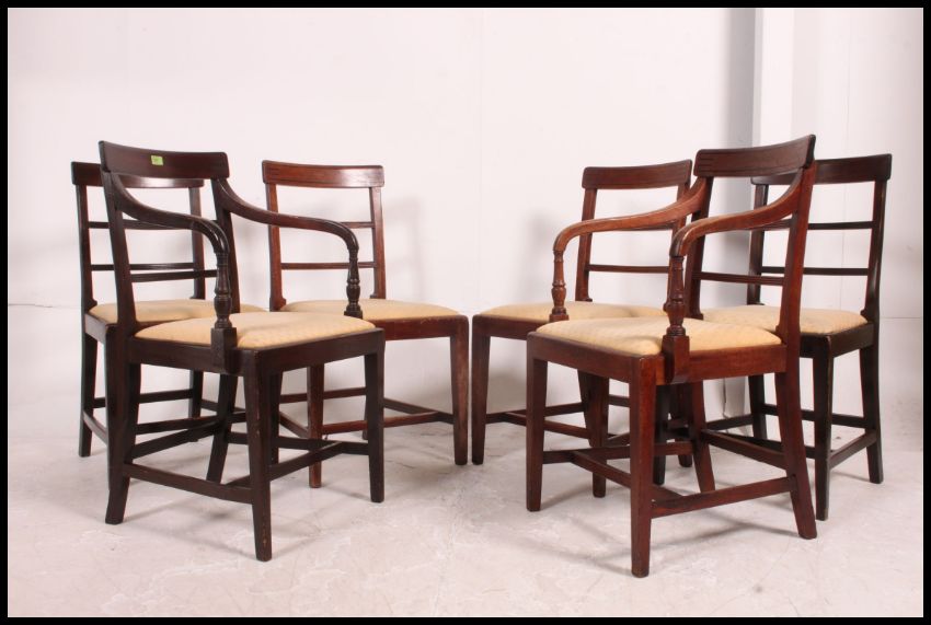 A harlequin set of 6 Regency mahogany bar back dining chairs all with the same upholstered drop in seats being raised on squared legs united by stretchers