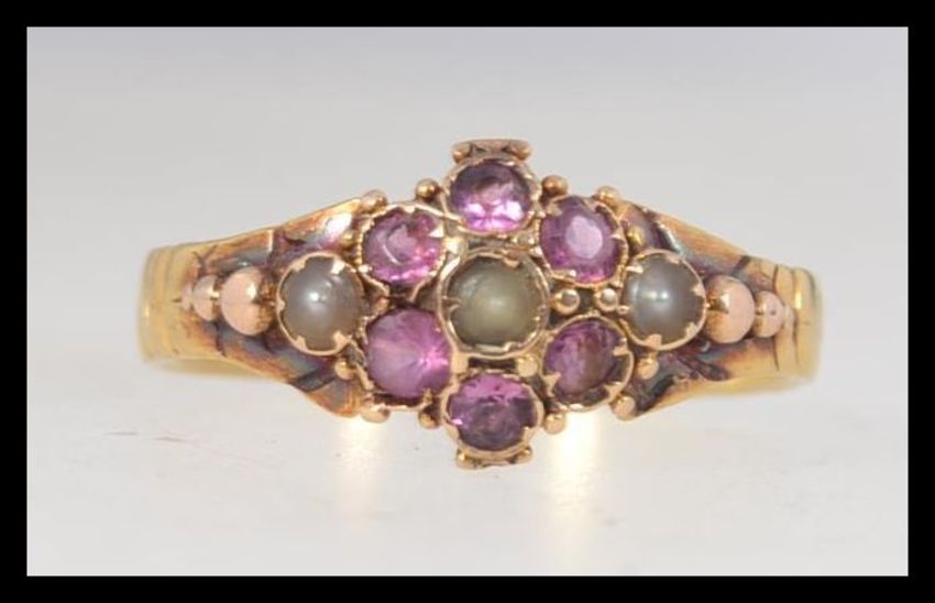 A Victorian tested 18ct gold pearl and amethyst set ladies ring set on decorative shank. Mark worn. Total weight 3.5g / Size O