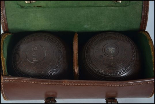 A vintage Jaquelite set of 2 lawn crown green bowling bowls measure bag bundle complete with the leather case