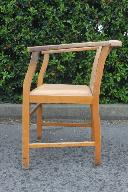 A set of 4 bentwood art deco dining chairs having faux cream leather upholstered seats and back rests. Raised on squared supports. Measures H74 x W50 x D54 (cm)