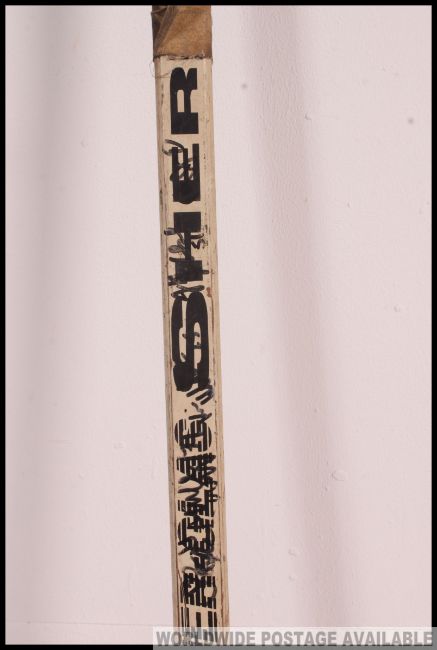 A signed Ice Hockey Stick by Sher-Wood Feather Glas being signed ( unknown ) to the stem.
