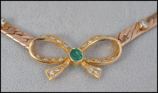 A good 9ct gold diamond and emerald necklace, earrings and bracelet set. Necklace: An unmarked tested 9ct gold herringbone chain with 6 5pt diamonds in a bezel setting with central Adams style bow with channel set diamonds 60pts to ribbon with central oval cut emerald chain having a clip clasp with safety catch. Total weight 23.5g. Measures 15.5 inches inc. bow 3.5cms. Bracelet:- A tested 9ct gold bangle marked 9ct with 4 5pt diamonds in a rub over setting with central Adams style bow with 60pts diamonds and central oval cut emerald with clip clasp. The centre of clip clasp is base metal with the release button and safety catch being 9ct gold. Total weight 17.6g. Measures inside bangle 6.5 inches, bow 3cms. Earrings:- Tested unmarked 9ct gold Adams bow earrings with push post backs with 40pts diamonds and two oval cut bezel set emeralds to centre. Backs test for 18ct. Total weight 4g. Measures bow 1.8cms.