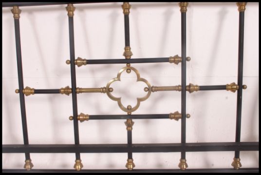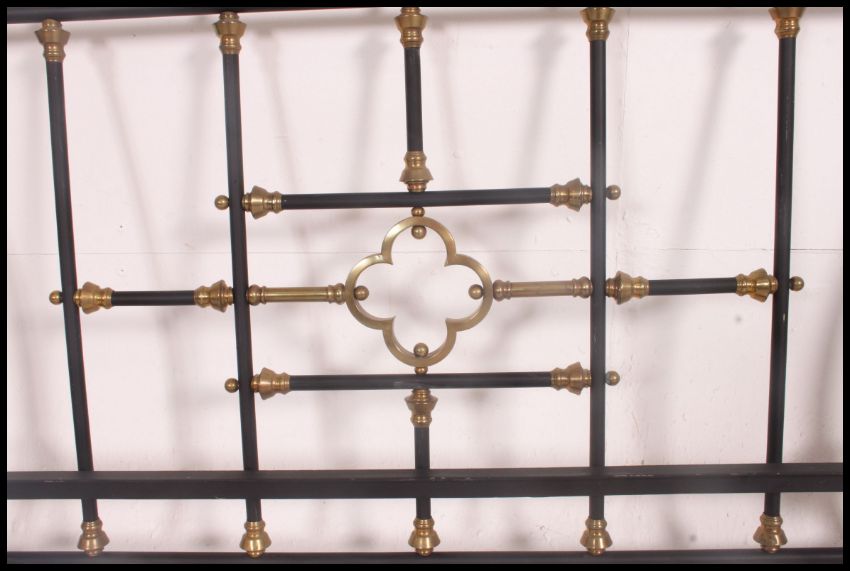 An early 20th century reconditioned French cast metal and brass bed, the railed head and footboards united by rails. 134cms x 214cms x 110cms