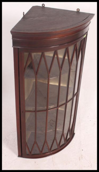 An Edwardian inlaid mahogany astragal glazed bow fronted corner cabinet having flared cornice with shelved interior. Measures H99 x W47 x D34 (cm).