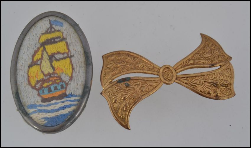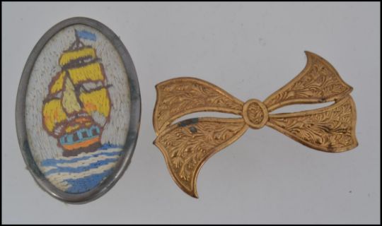 A 1920s vintage gold tone brooch in the shape of a bow with embossed foliate decoration. Measures 7cms. Together with a a 1920s white metal locket brooch containing a silkwork picture of a galleon. Measures 6cms.