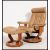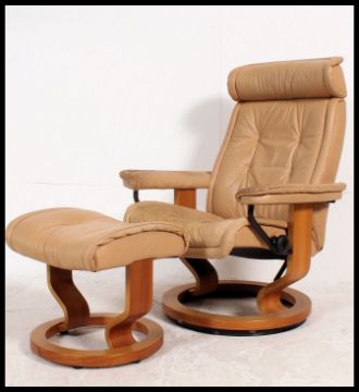 A vintage 20th century Ekornes ' Stressless ' reclining swivel armchair raised on bentwood base with tan leather upholstery complete with the ottoman footstool. Measures H100 x W77 x D66 (cm).