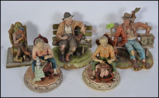 A collection of five Capodimonte figure groups to include tramps, old men sewing please see images H27cm