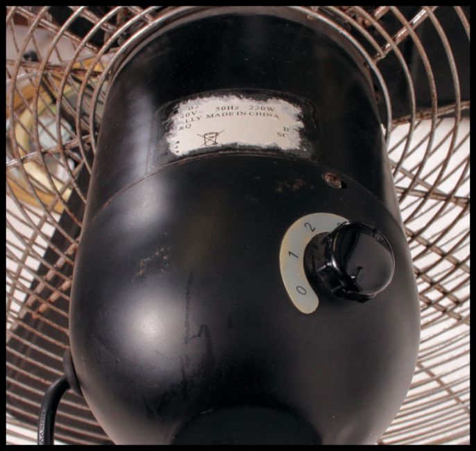 A very large oversized industrial bladed fan. On a large cast iron circular base, with metal cage surrounding fan. Measures H145 x W84 x D66 (cm)